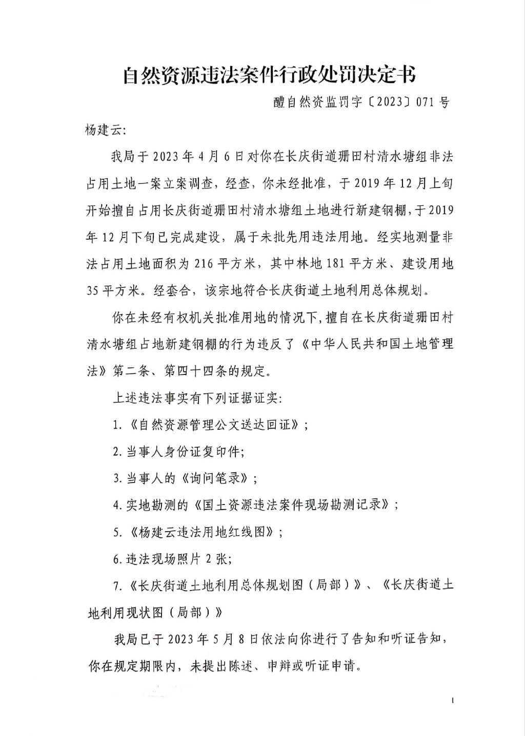 自然资源违法案件行政处罚决定书(杨建云)