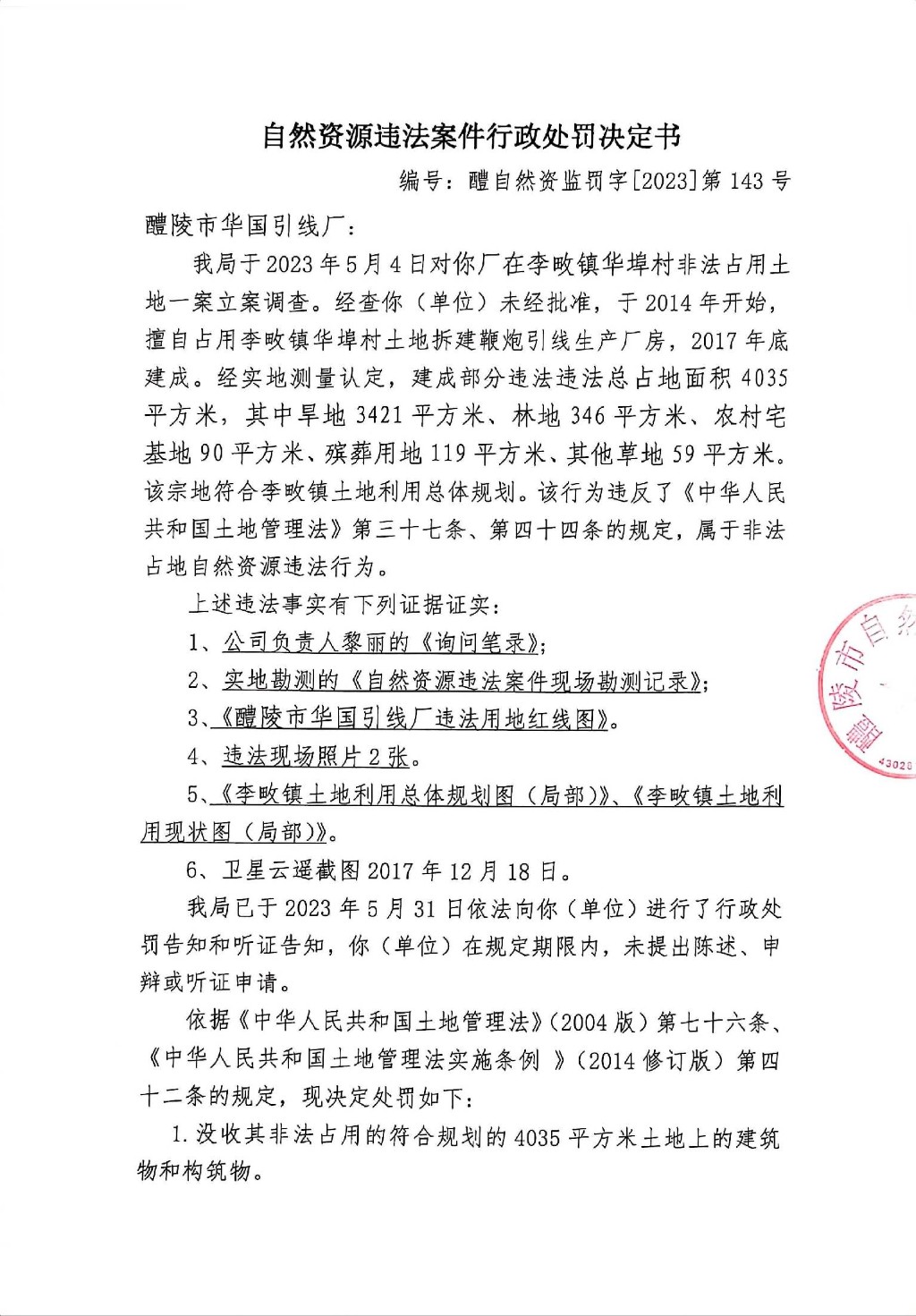 自然资源违法案件行政处罚决定书(醴陵市华国引线厂)