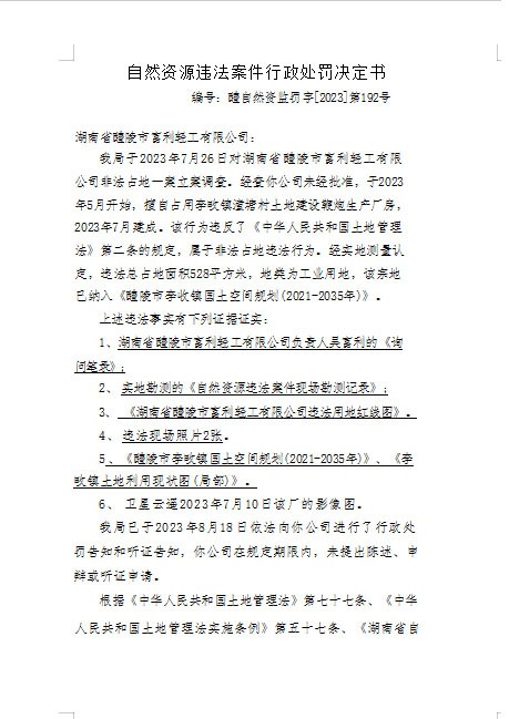 自然资源违法案件行政处罚决定书(湖南省醴陵市富利轻工有限公司醴自然资监罚字【2023】192号)