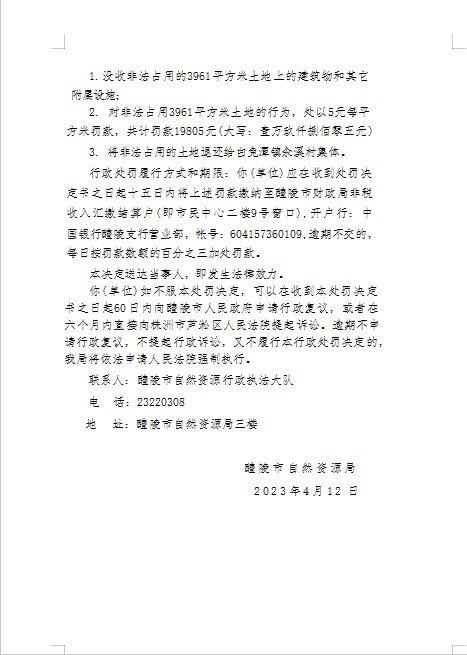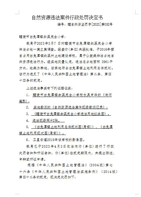 自然资源违法案件行政处罚决定书(醴陵市白兔潭镇汆溪完全小学编号醴自然资监罚字【2023】52号)