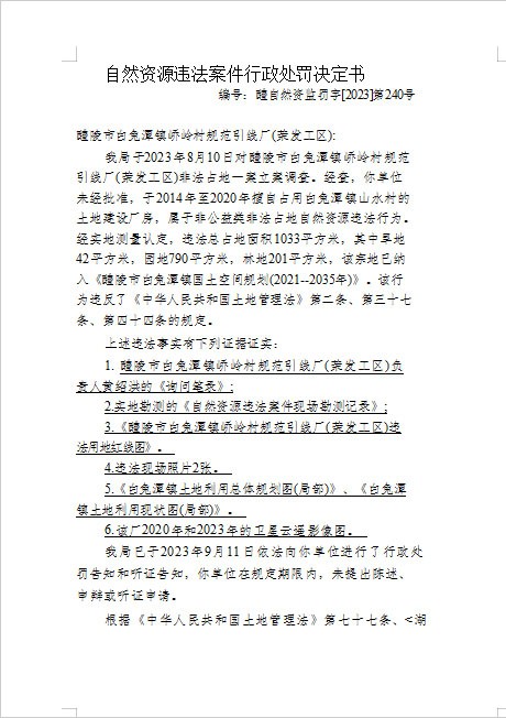 自然资源违法案件行政处罚决定书(醴陵市白兔潭镇峤岭村规范引线厂(荣发工区)醴自然资监罚字【2023】240号)