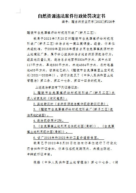 自然资源违法案件行政处罚决定书(醴陵市白兔潭镇峤岭村规范引线厂(新月工区)醴自然资监罚字【2023】226号)