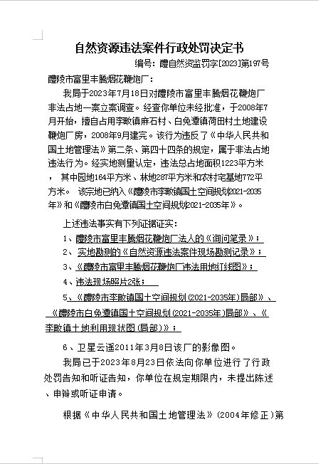 自然资源违法案件行政处罚决定书(醴陵市富里封腾烟花鞭炮厂醴自然资监罚字【2023】197号)