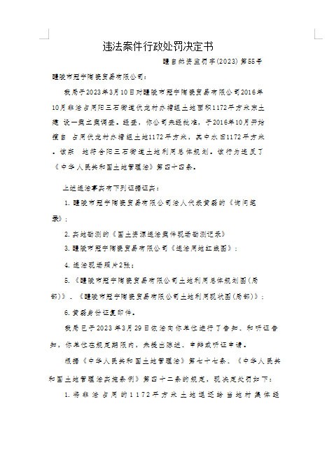 自然资源违法案件行政处罚决定书(醴陵市冠宁陶瓷贸易有限公司醴自然资监罚字【2023】55号)