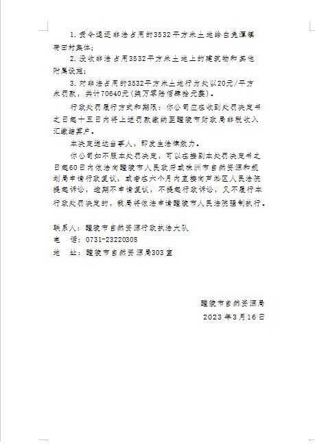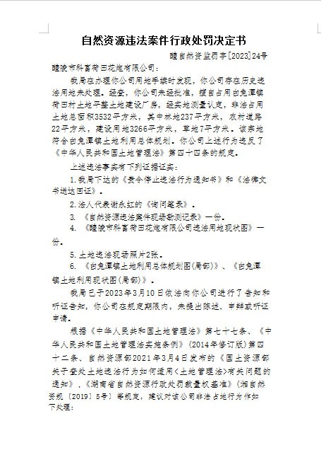 自然资源违法案件行政处罚决定书(醴陵市科富荷田花炮有限公司醴自然资监罚字【2023】24号)