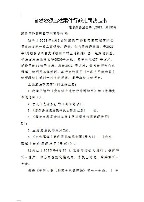 自然资源违法案件行政处罚决定书(醴陵市科富荷田花炮有限公司醴自然资监罚字【2023】190号)