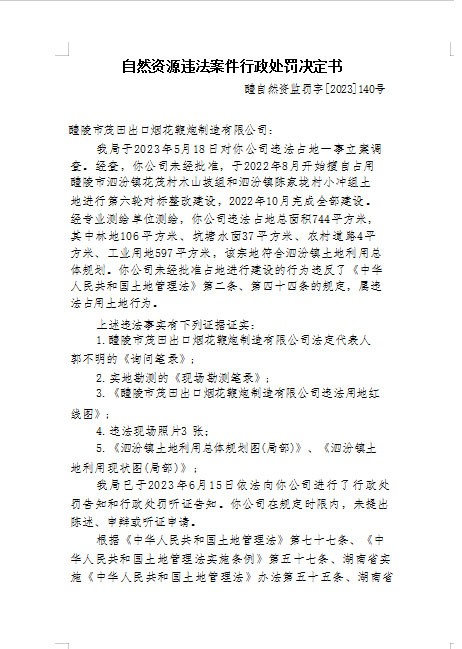 自然资源违法案件行政处罚决定书(醴陵市茂田出口烟花鞭炮制造有限公司醴自然资监罚字【2023】140号)