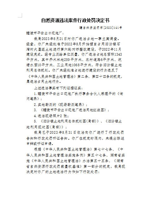自然资源违法案件行政处罚决定书(醴陵市平云出口花炮厂醴自然资监罚字【2023】141号)