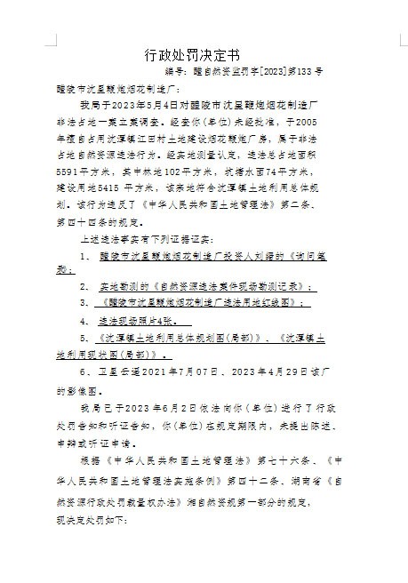 自然资源违法案件行政处罚决定书(醴陵市沈星鞭炮烟花制造厂醴自然资监罚字【2023】133号)