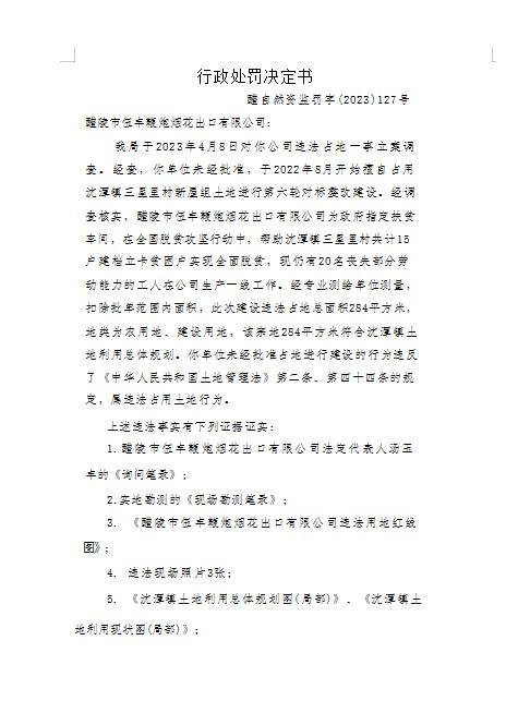 自然资源违法案件行政处罚决定书(醴陵市伍丰鞭炮烟花出口有限公司醴自然资监罚字【2023】127号)