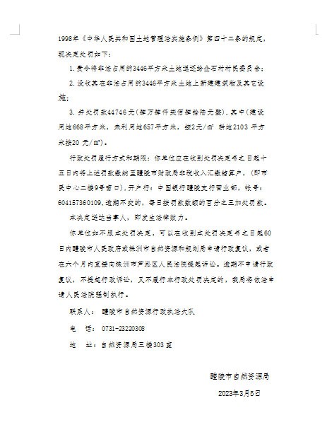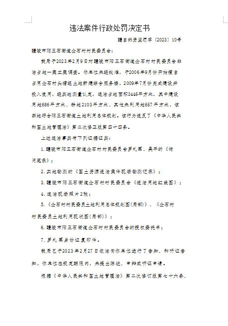 自然资源违法案件行政处罚决定书(醴陵市阳三石街道企石村村民委员会醴自然资监罚字【2023】10号)