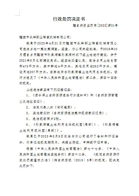 自然资源违法案件行政处罚决定书(醴陵市永祥郅业陶瓷机械有限公司醴自然资监罚字【2023】31号)