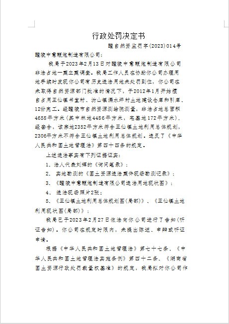 自然资源违法案件行政处罚决定书(醴陵中意鞭炮制造有限公司醴自然资监罚字【2023】014号)