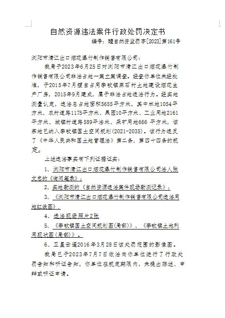 自然资源违法案件行政处罚决定书(浏阳市清江出口烟花爆竹制作销售有限公司醴自然资监罚字【2023】161号)