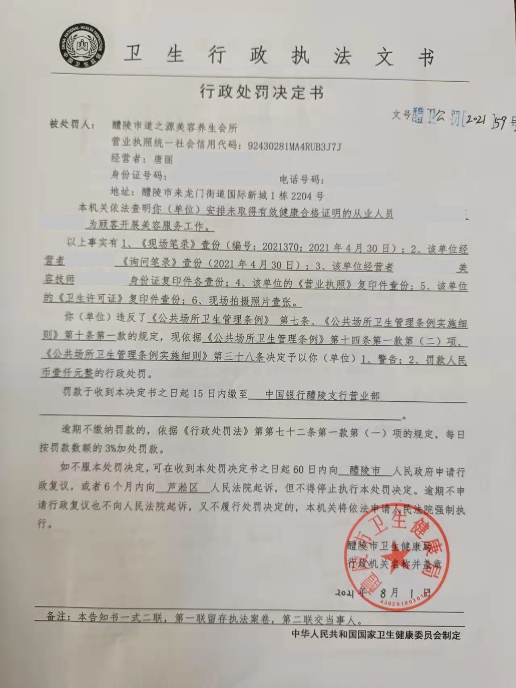 醴卫公罚[2021]59号