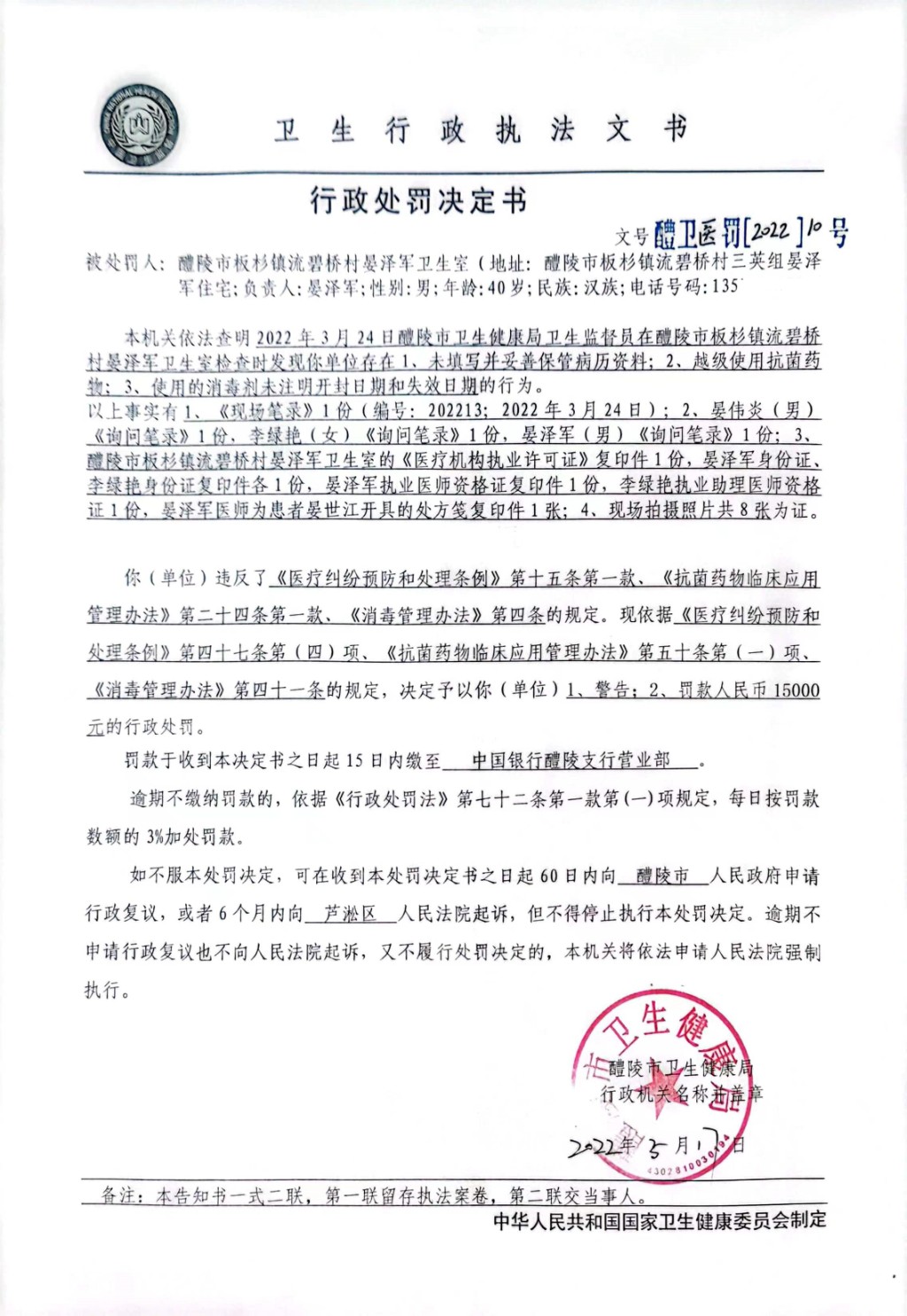 醴卫公罚[2022]10号