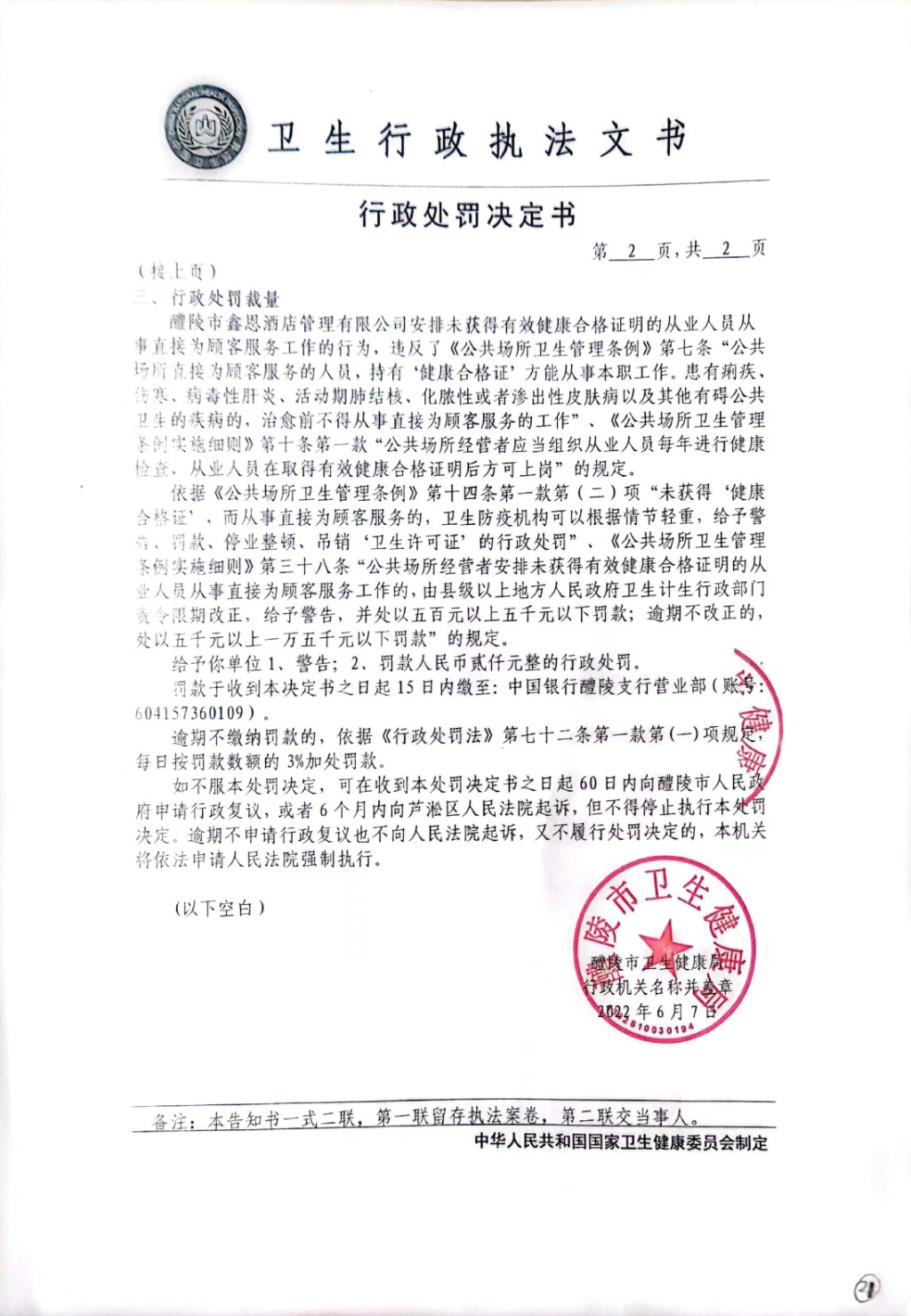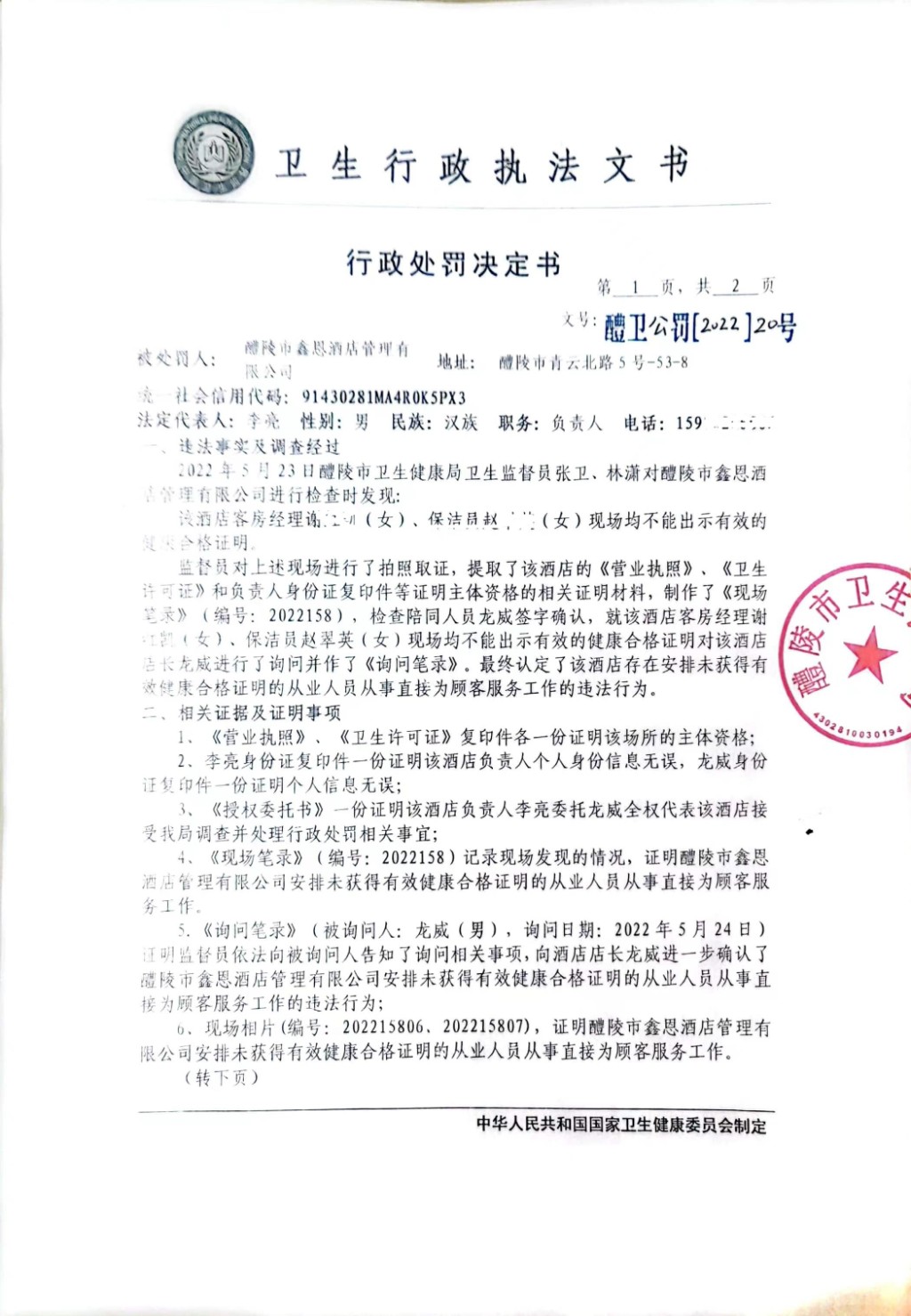 醴卫公罚[2022]20号