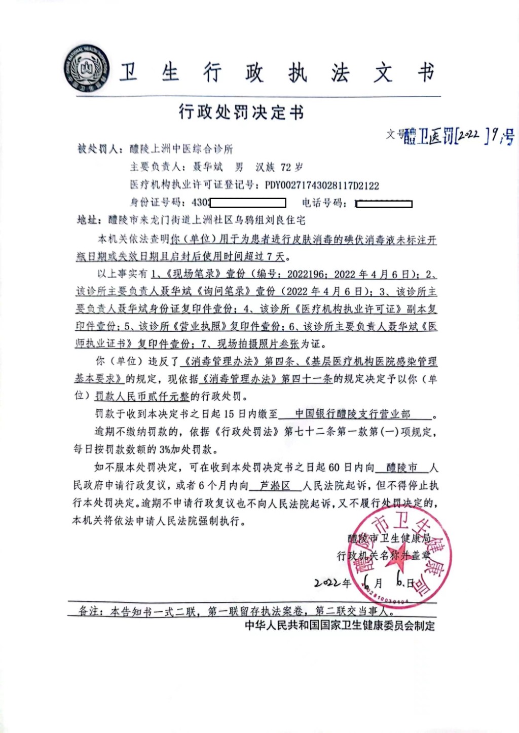 醴卫医罚[2022]9号