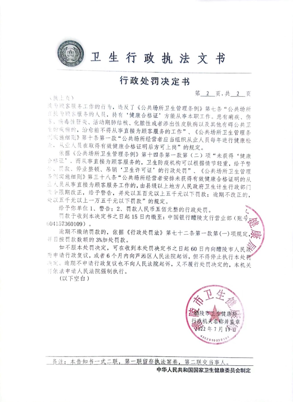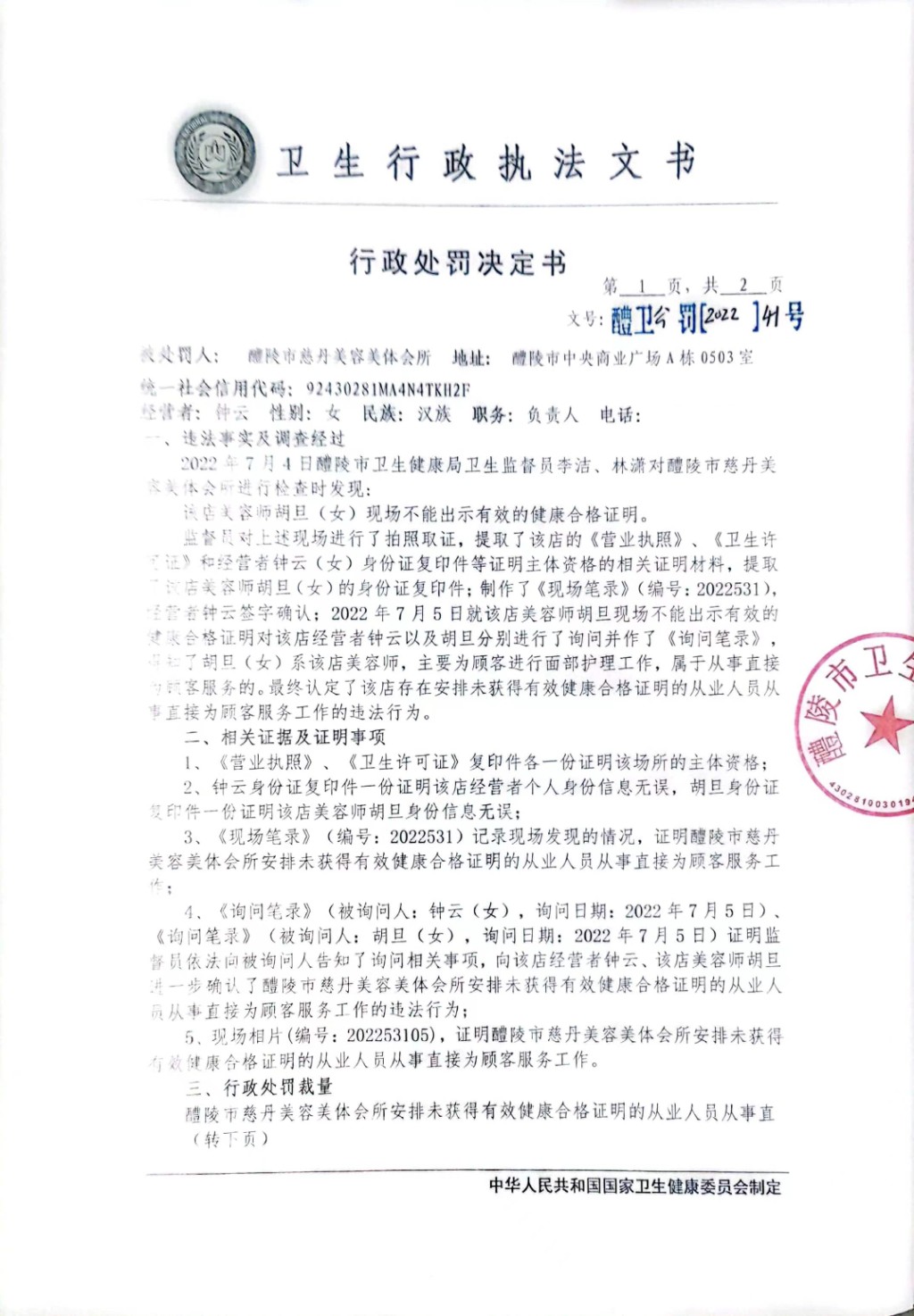醴卫公罚[2022]41号