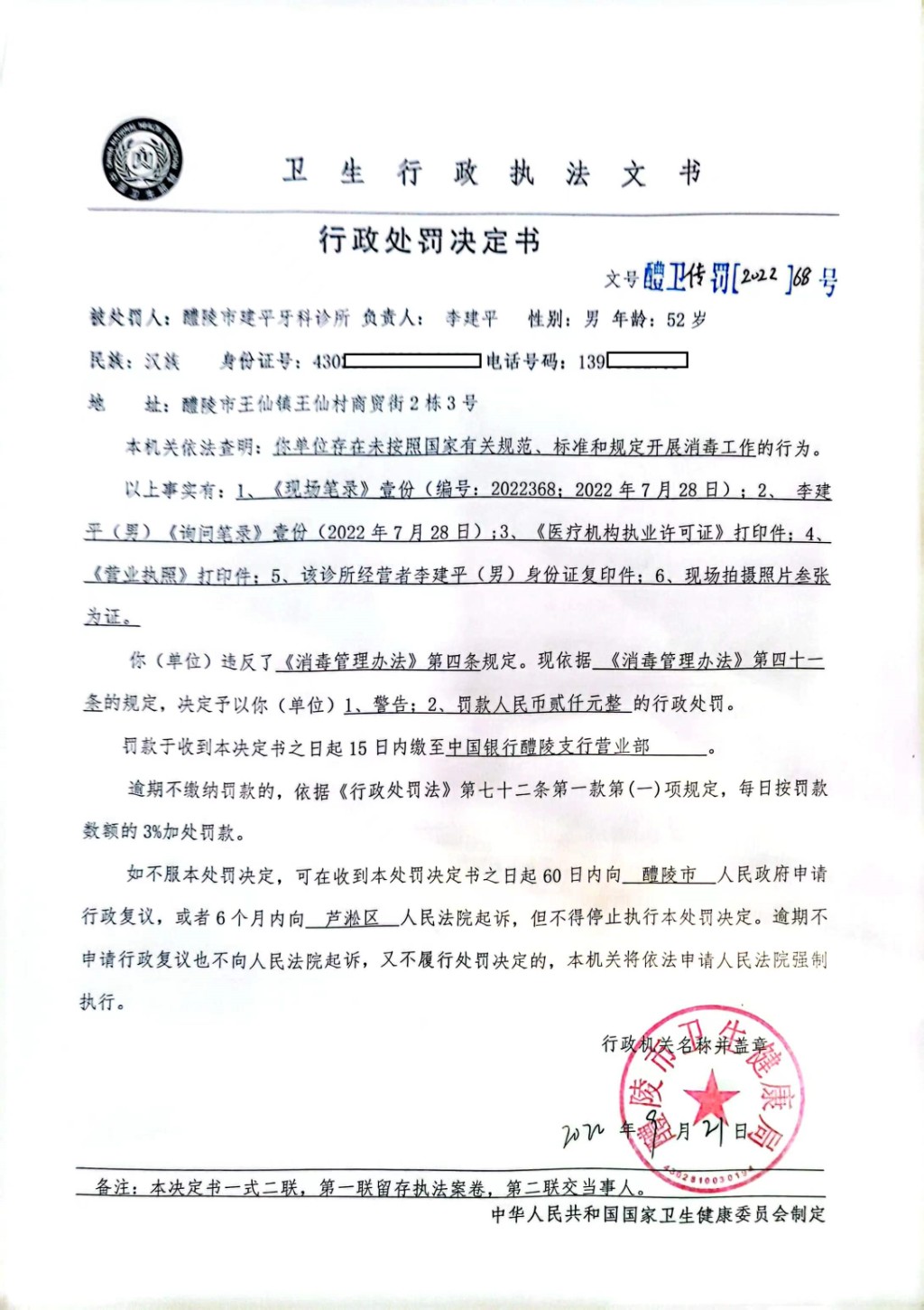 醴卫传罚[2022]68号