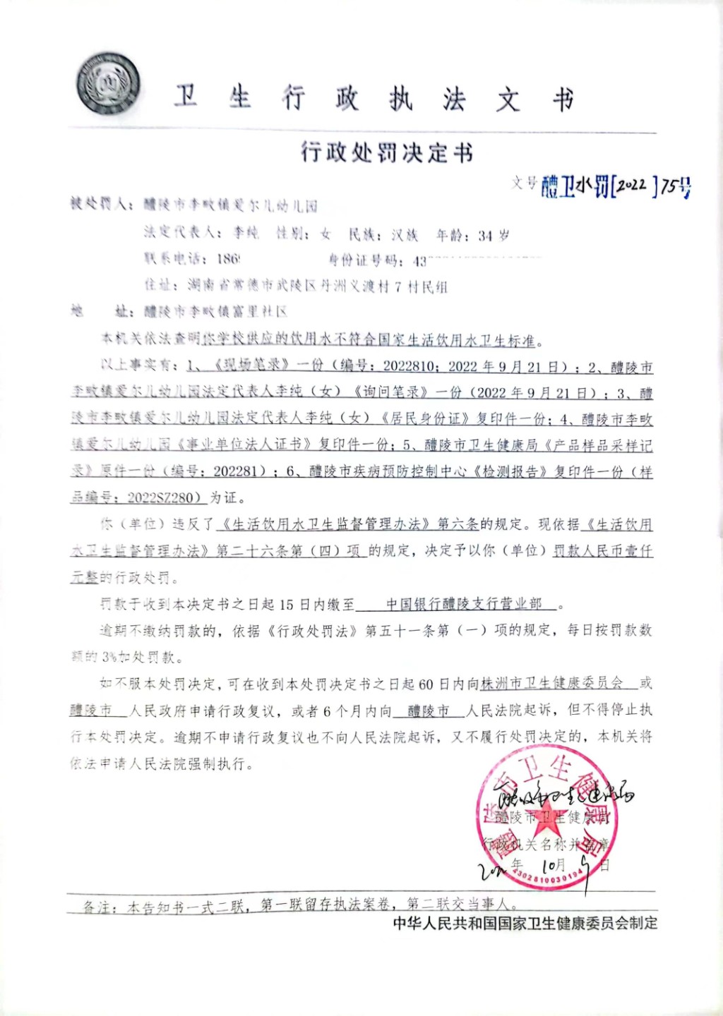 醴卫水罚[2022]75号