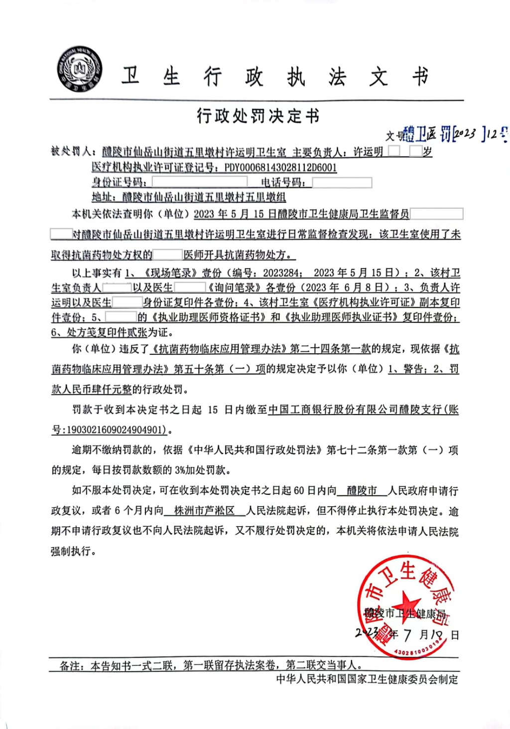 醴卫医罚[2023]12号
