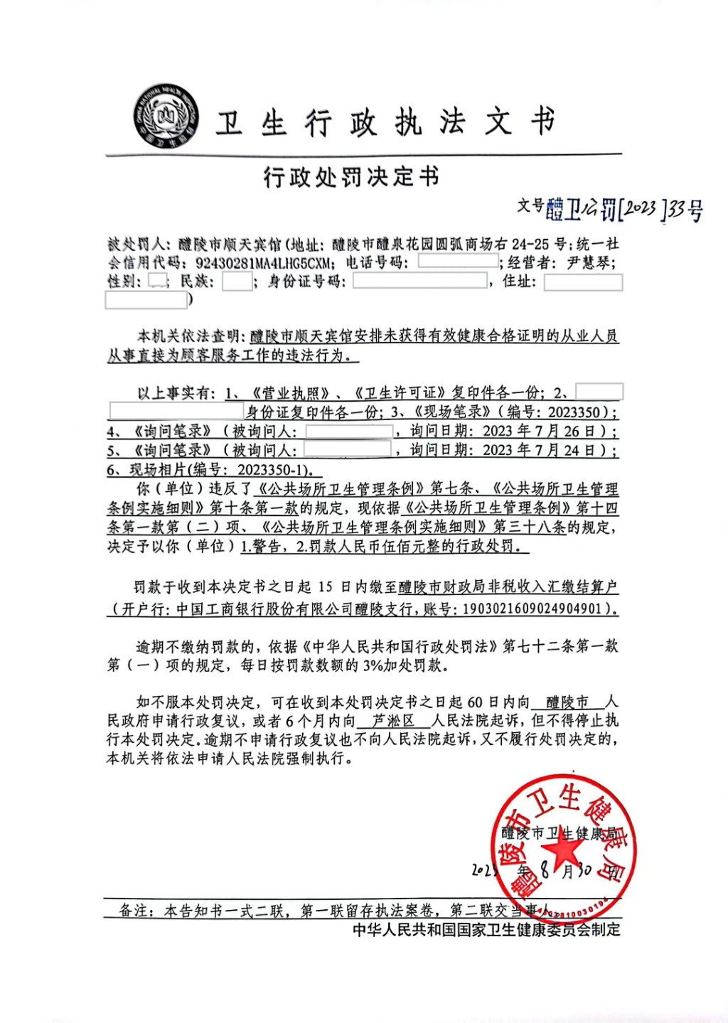醴卫公罚[2023]33号