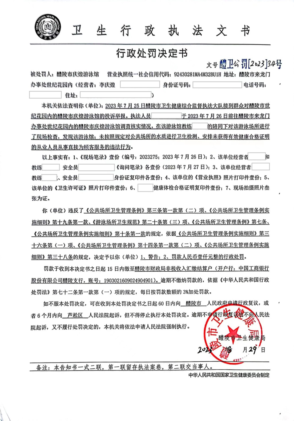 醴卫公罚[2023]34号