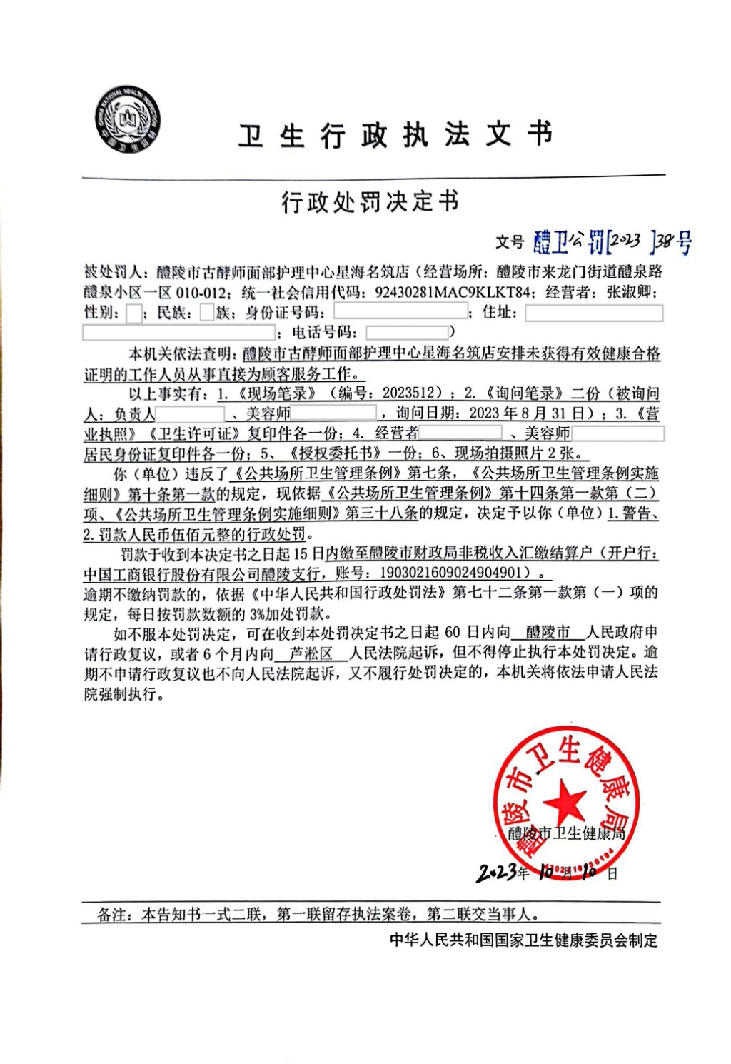 醴卫公罚[2023]38号