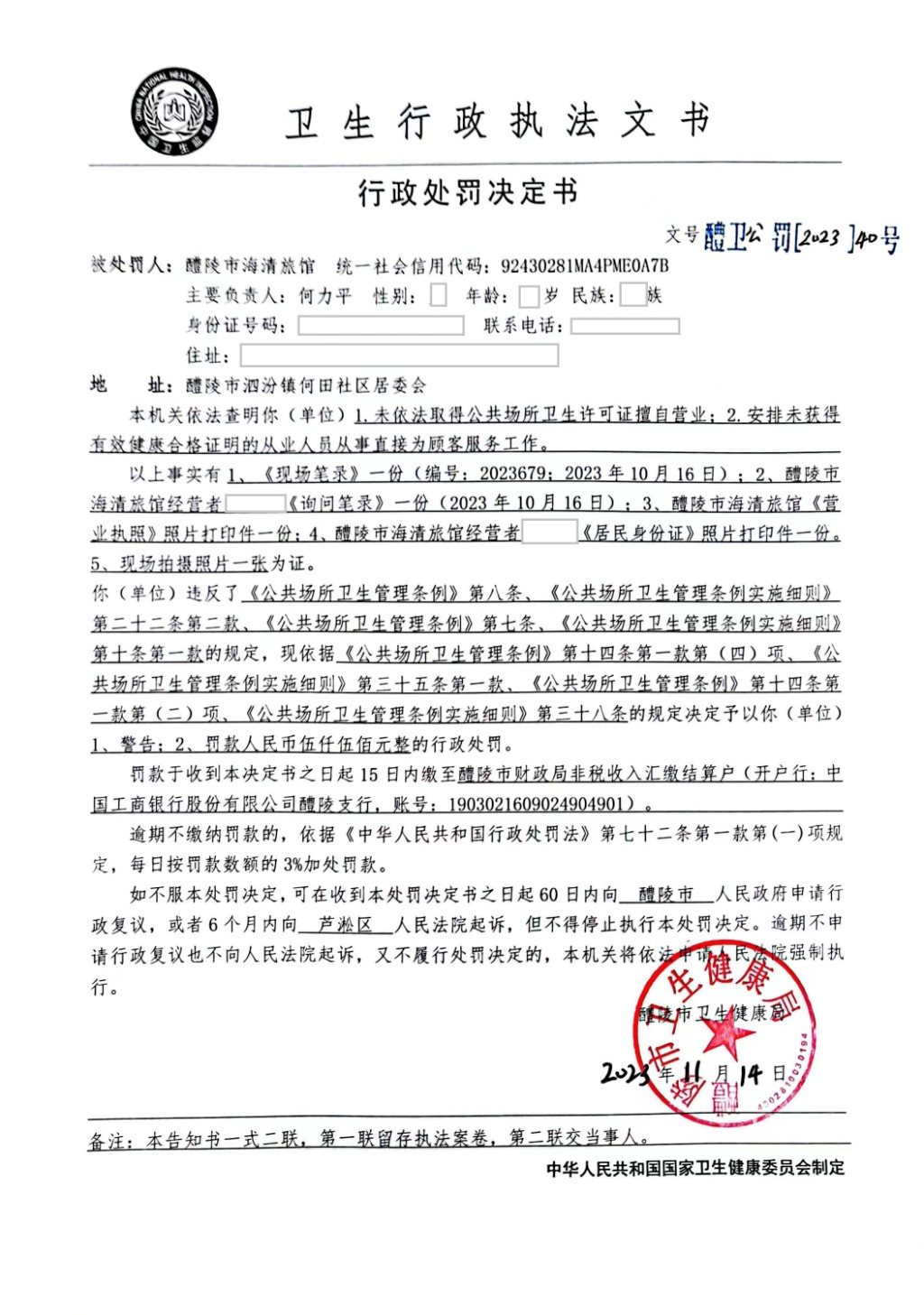 醴卫公罚 〔2023〕40号