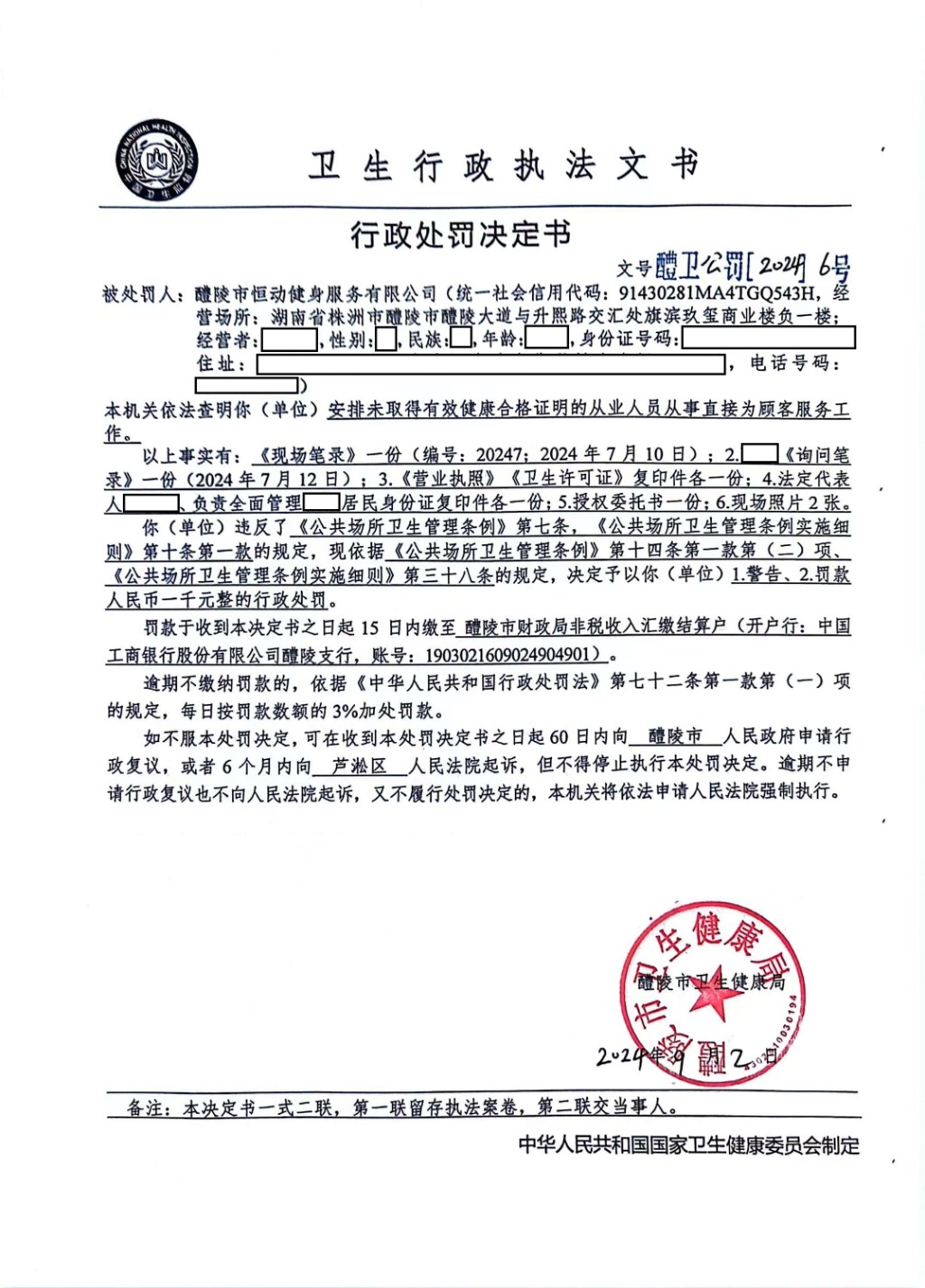 醴卫公罚〔2024〕6号