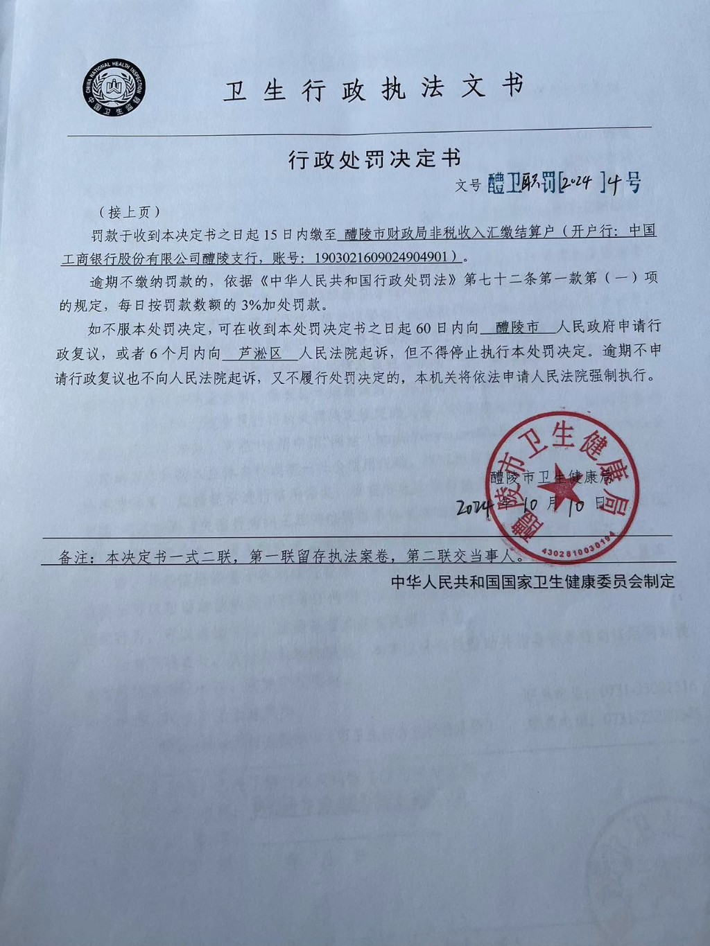 醴卫职罚 〔2024〕4号