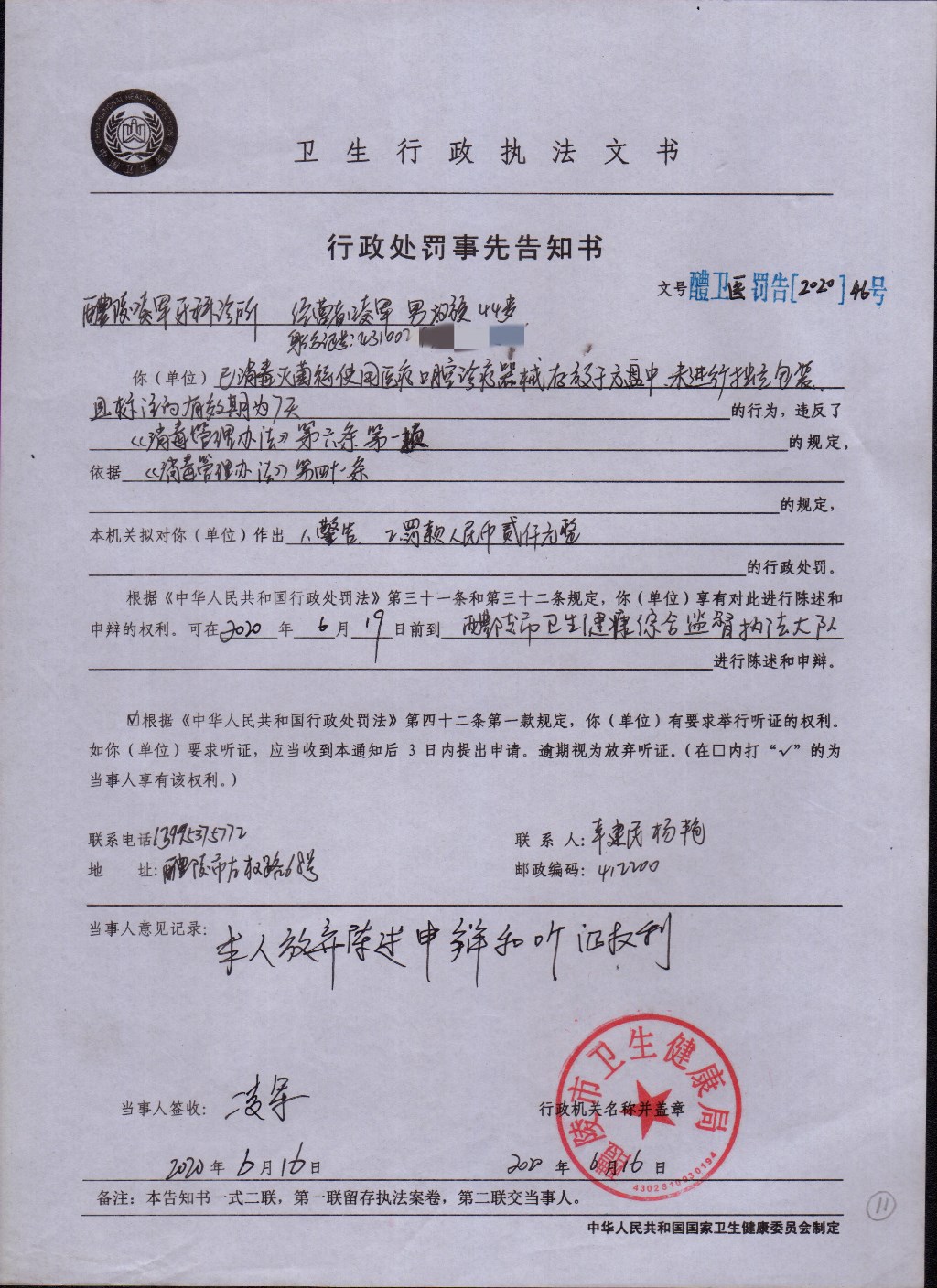 醴卫医罚[2020]46号