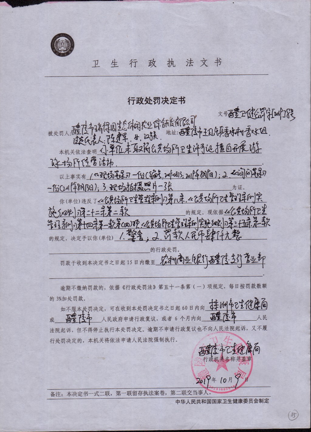 醴卫健公罚字[2019]8号