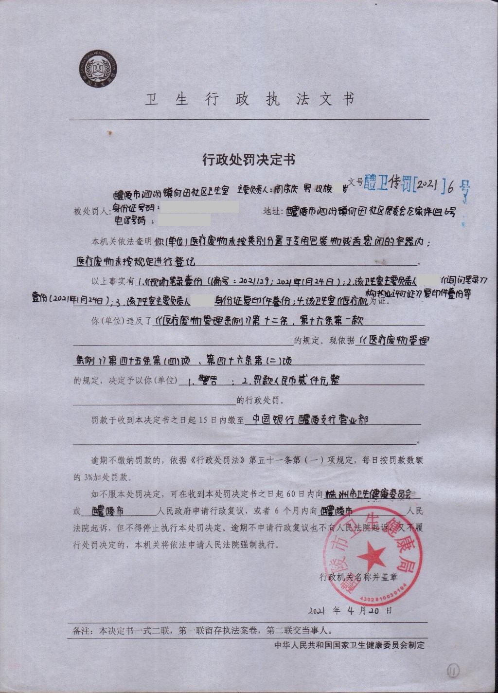 醴卫传罚[2021] 6号