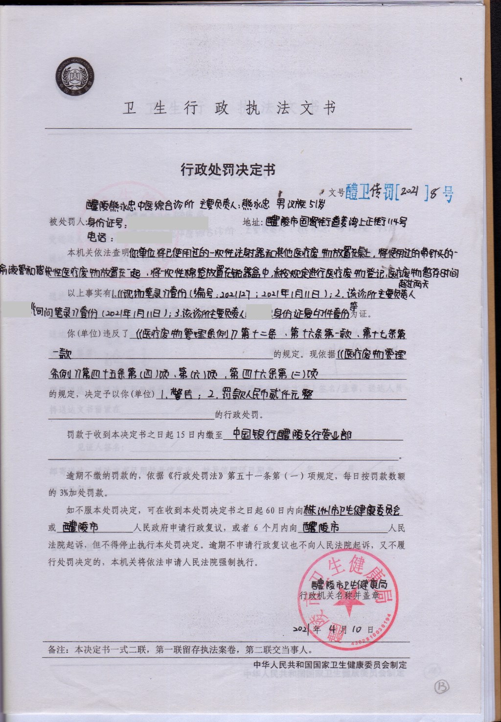 醴卫传罚[2021] 8号