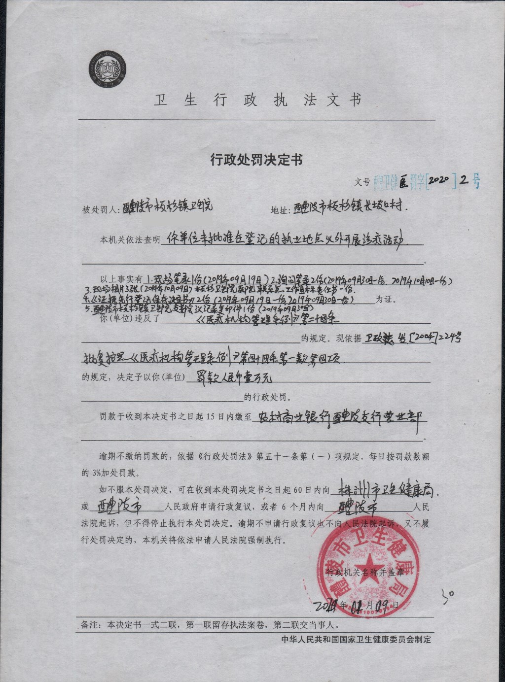 醴卫健医罚字[2020]2号