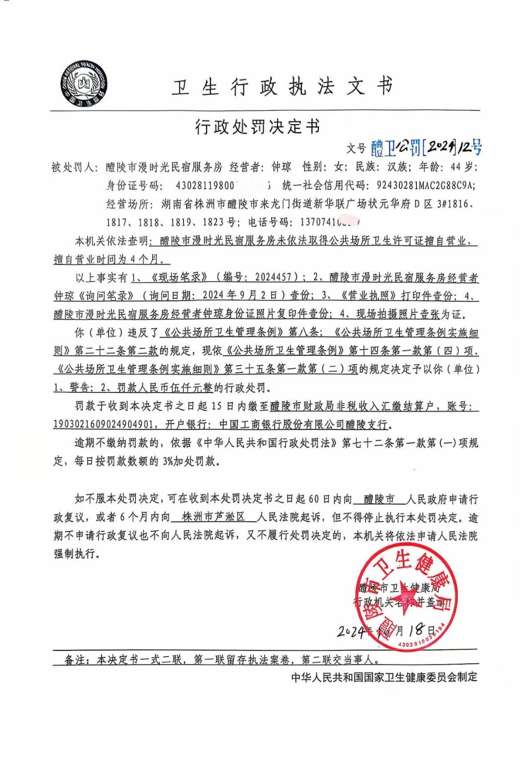 醴卫公罚【2024】12号