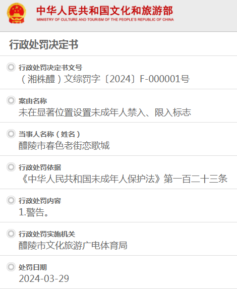 醴陵市文化旅游广电体育局行政处罚决定书(湘株醴)文综罚字〔2024〕F-000004号