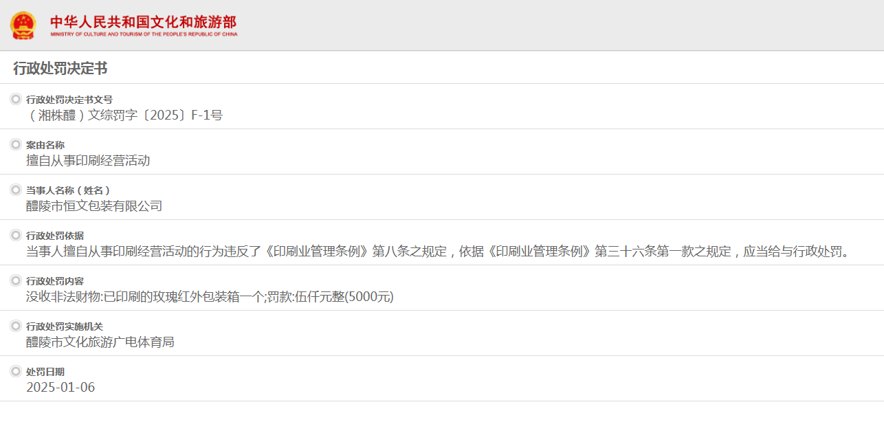 2024年12月30日9时55分至2024年12月30日10时35分,醴陵市文化旅游广电体育局执法人员张宁(180208210012)、邓绍鑫(180208210010)在出示执法证件后,对醴陵市浦口镇仙石村健关坪组7号醴陵市恒文包装有限公司检查时,该厂财务负责人金宝丹全程陪同,发现当事人生产车间一台5色印刷机正在印刷“玫瑰红”花炮外包装箱,执法人员要求提供《营业执照》和《印刷经营许可证》,当事人提供《营业执照》,无法当场提供《印刷经营许可证》,执法人员告知当事人擅自从事印刷经营活动,其行为违反了《印刷业管理条例》第十条的规定。执法人员当即责令其停止违法经营活动,对现场印刷的外包装箱进行清点,其中已印刷的印刷品为55件,未印刷的空外包装箱145件,并依法做出如下处理:1、制作《现场检查(勘验)笔录》,如实记录现场执法情况;2、下达《责令改正通知书》,责令当事人停止违法行为,对当事人进行法制宣传教育,当事人当场自觉对已印刷的印刷品54件通过机器销毁;3、出具《抽样取证》、《物品清单》保留一个纸箱做为证据;4、出具《调查询问通知书》,要求该厂投资人易海到醴陵市文化旅游广电体育局进一步调查询问。