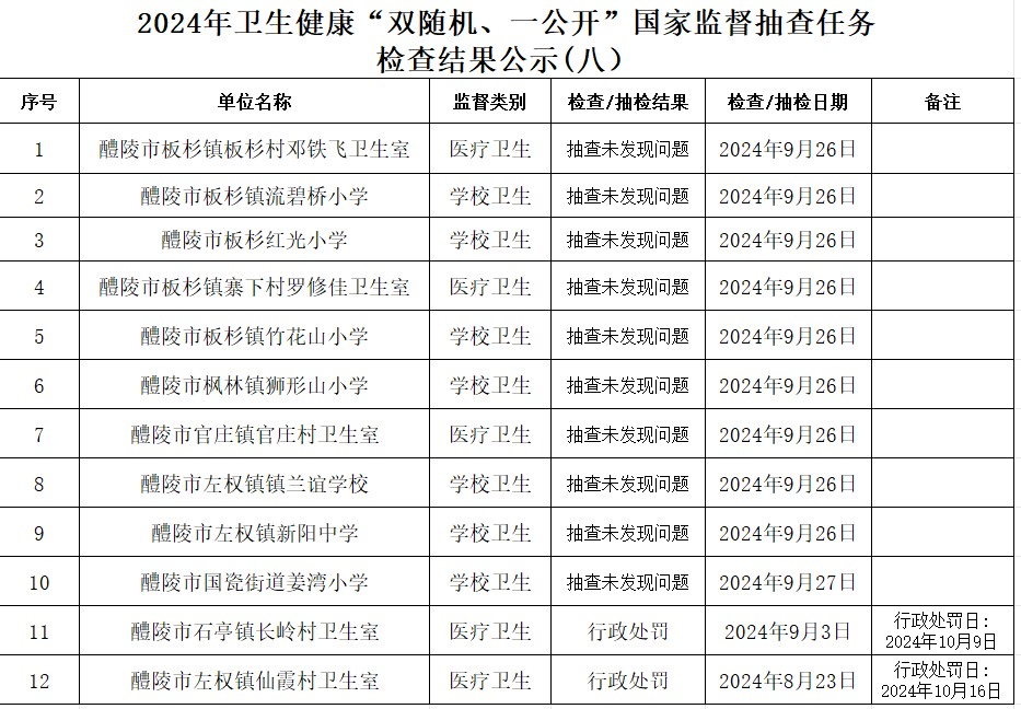 2024年卫生健康“双随机、一公开”国家监督抽查任务 检查结果公示(八)