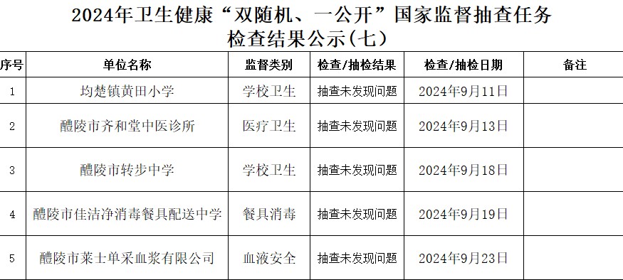 2024年卫生健康“双随机、一公开”国家监督抽查任务 检查结果公示(七)
