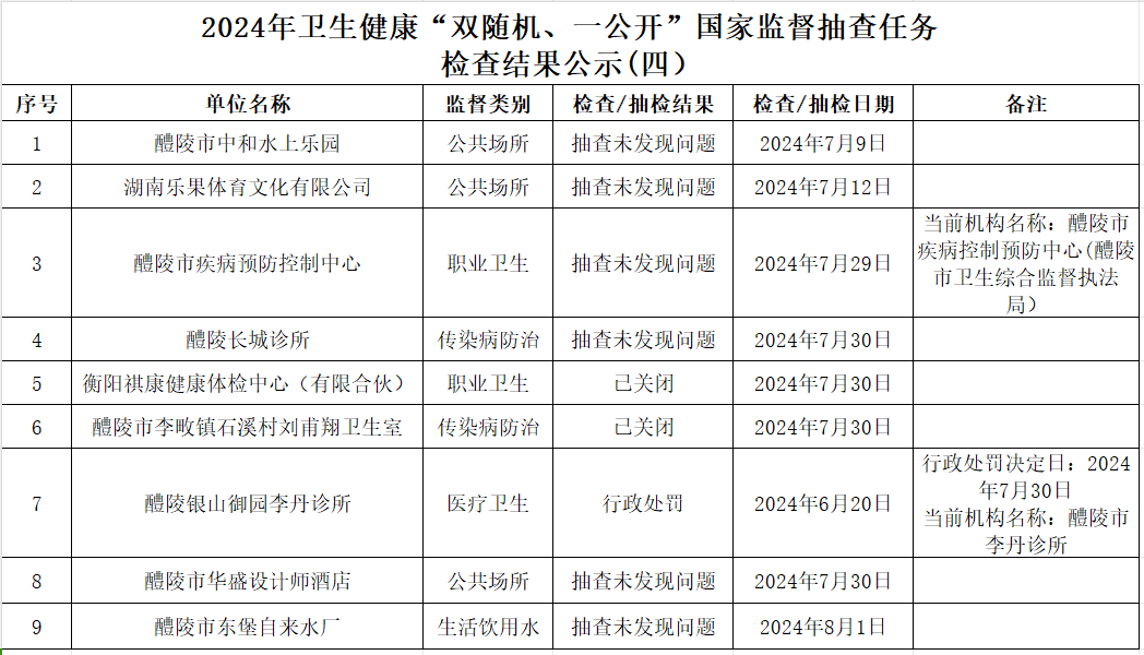 2024年卫生健康“双随机、一公开”国家监督抽查任务检查结果公示(四)