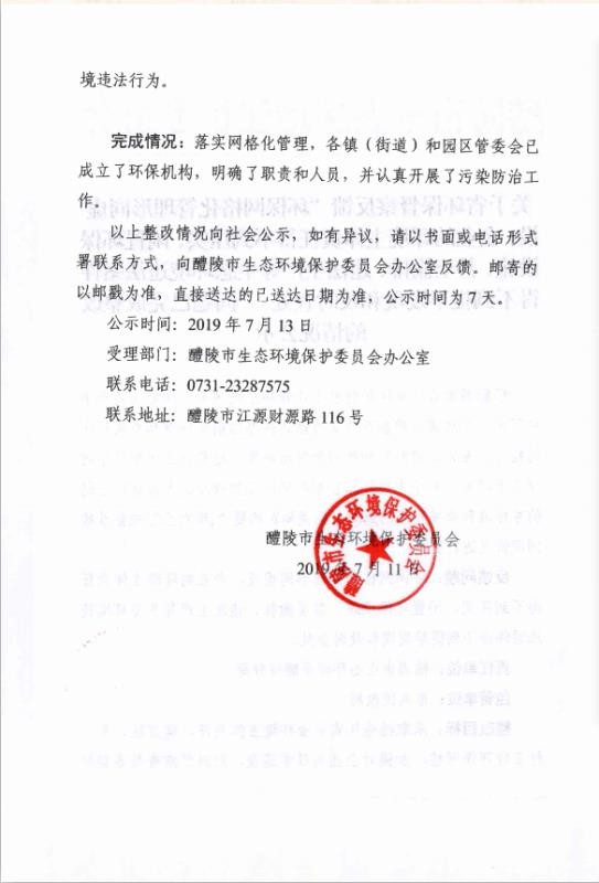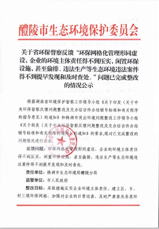 关于省环保督察反馈“环保网格化管理形同虚设,企业的环境主体责任得不到压实,闲置环保设施,甚至偷排、违法生产等生态环境违法案件得不到提早发现和及时查处。”问题已完成整改的情况公示