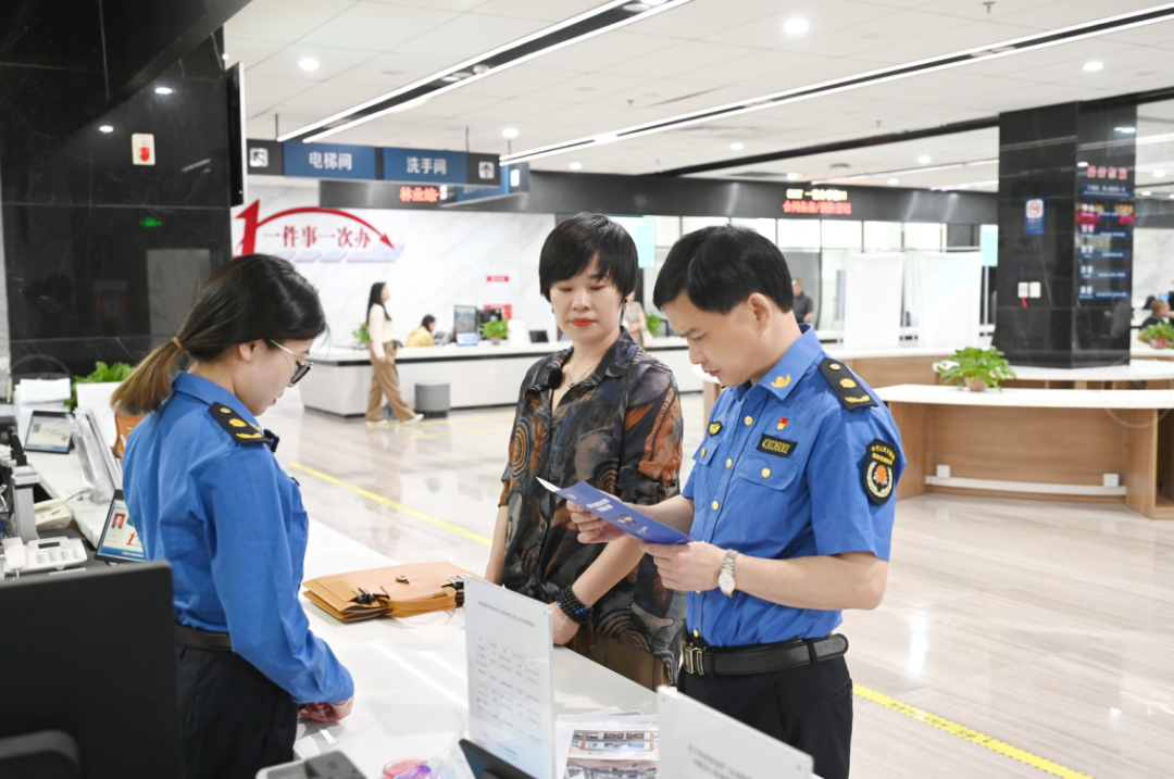 在市民中心城管窗口,市城管局党组书记、局长谢建林,政协委员苏文以群众视角,全流程体验户外广告设施审批办理、诉求响应等服务事项,并深入了解后台审批流程以及户外广告管理相关规范。