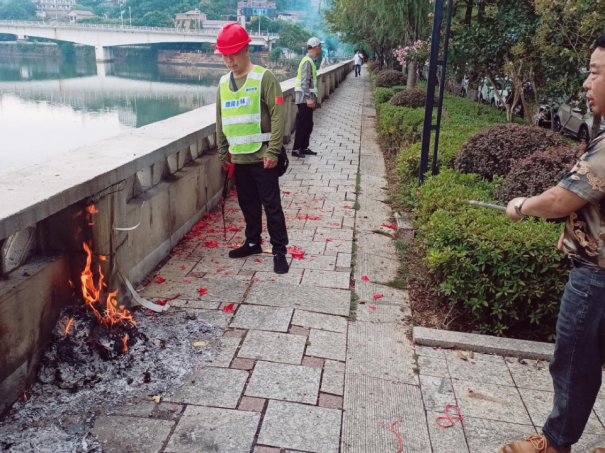 在中心城区渌江河沿线,市环卫中心增派清扫力量,增加清扫频率,延长巡回保洁时间,对祭祀后产生的祭祀品残余"随产随清",针对沿河步道、滨河路人行道砖缝中堆积的燃烧灰尘,安排人员进行清洗,全力保障城区环境卫生质量。