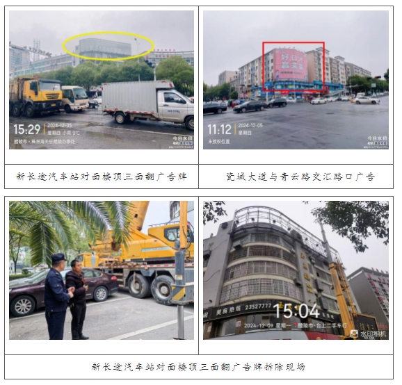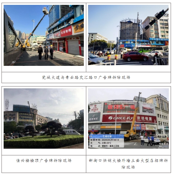 本次集中拆除为期7天,共拆除广告设施面积400余平方米,其中新长途汽车站对面楼顶三面翻广告牌224平方米,瓷城大道与青云路交汇路口三面翻广告牌208平方米。