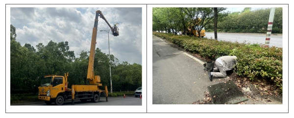 4月21日上午11点30分,渌江大道三期。维护人员对巡查发现的8盏路灯不亮问题进行处理。经现场检测,确定为线路故障,维护人员立即进行处置,20分钟不到,8盏路灯全面恢复亮灯。