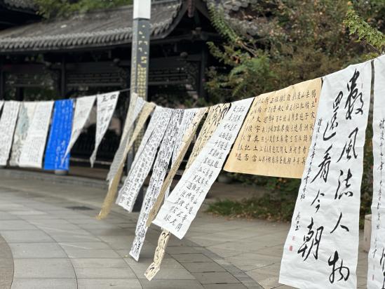 走进活动现场,一幅幅书画作品随金秋的微风轻轻飘荡,吸引着人的目光,空气中花香与墨香交织在一起,好一派热闹景象。书画展分为成果展示区及现场创作区。成果展示区作品内容多以歌颂祖国,歌颂党的现代诗词为主,书法作品篆隶楷行草,各领风骚,绘画作品色彩斑斓,搭配协调,给人以美感和艺术享受。