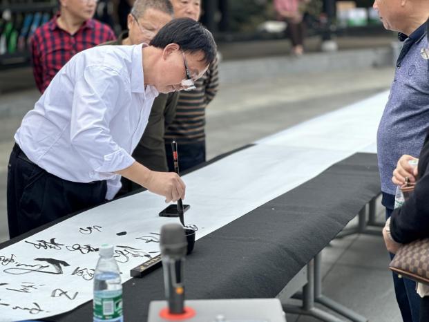 创作区内设有一张大的书画案台,学员们现场挥毫,一个个行云流水,落笔如云烟,接力共同创作出《百米长卷颂党恩》画卷。